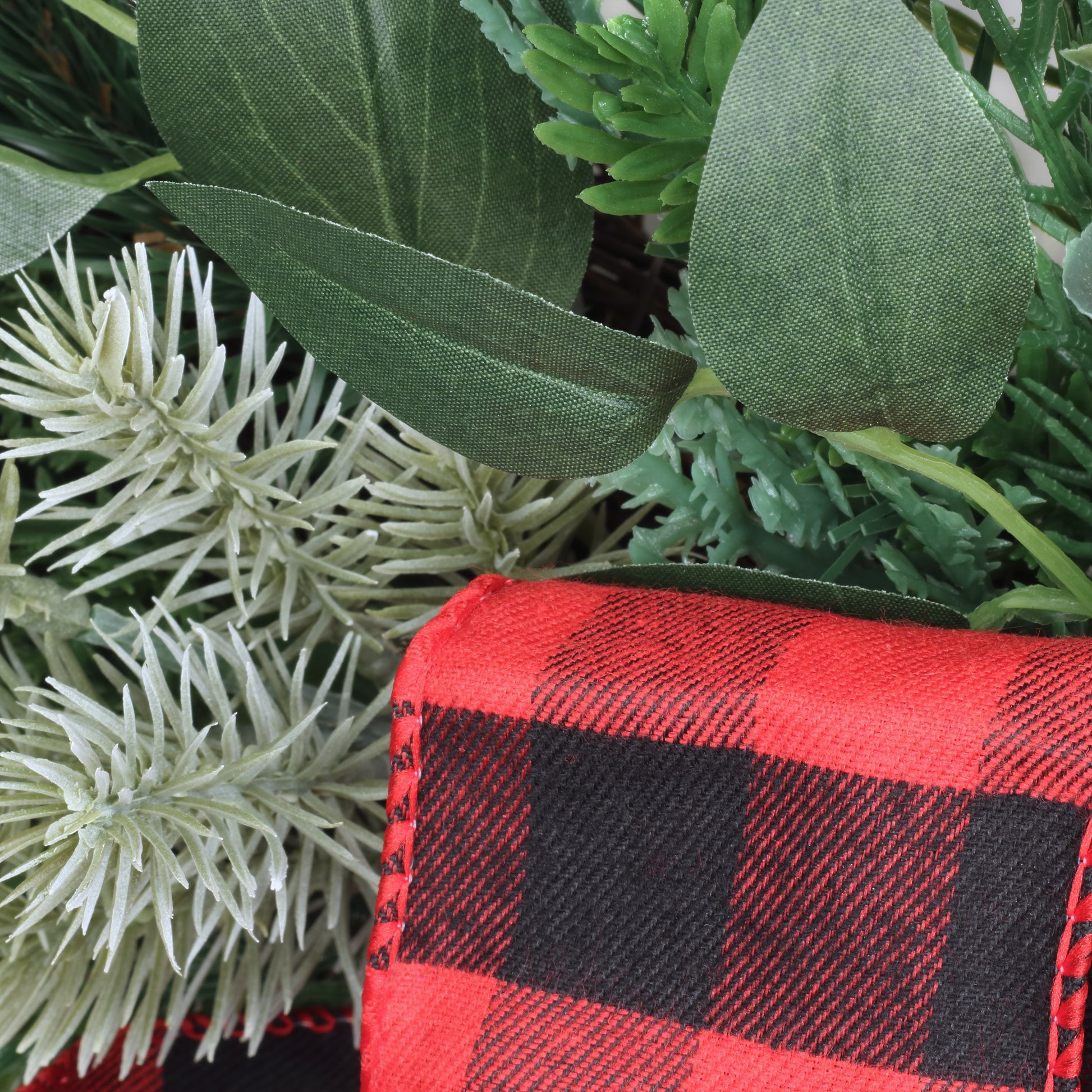 • These fantastically festive swags feature evergreen branches and long leafy greens sprouting from woven branch bases, each decorated with a black and red plaid ribbon and bow